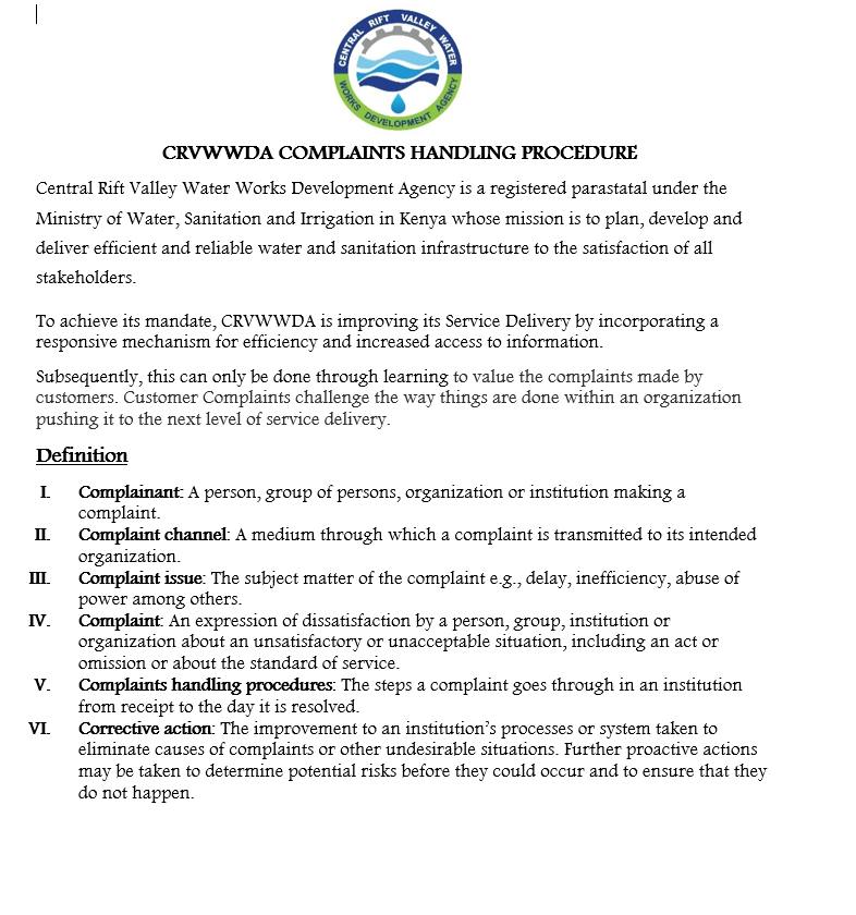 The Central Rift Valley Water Works Development Agency (CRVWWDA) is one of the nine (9) Water Works Development Agencies in Kenya and was formed under Section 65 of the Water Act, 2016. It was established through Kenya Gazette Notice No. 4 dated 7thFebruary 2020. The region served by the Agency comprise of the five Counties of Nakuru, Narok, Laikipia, Baringo and Nyandarua.